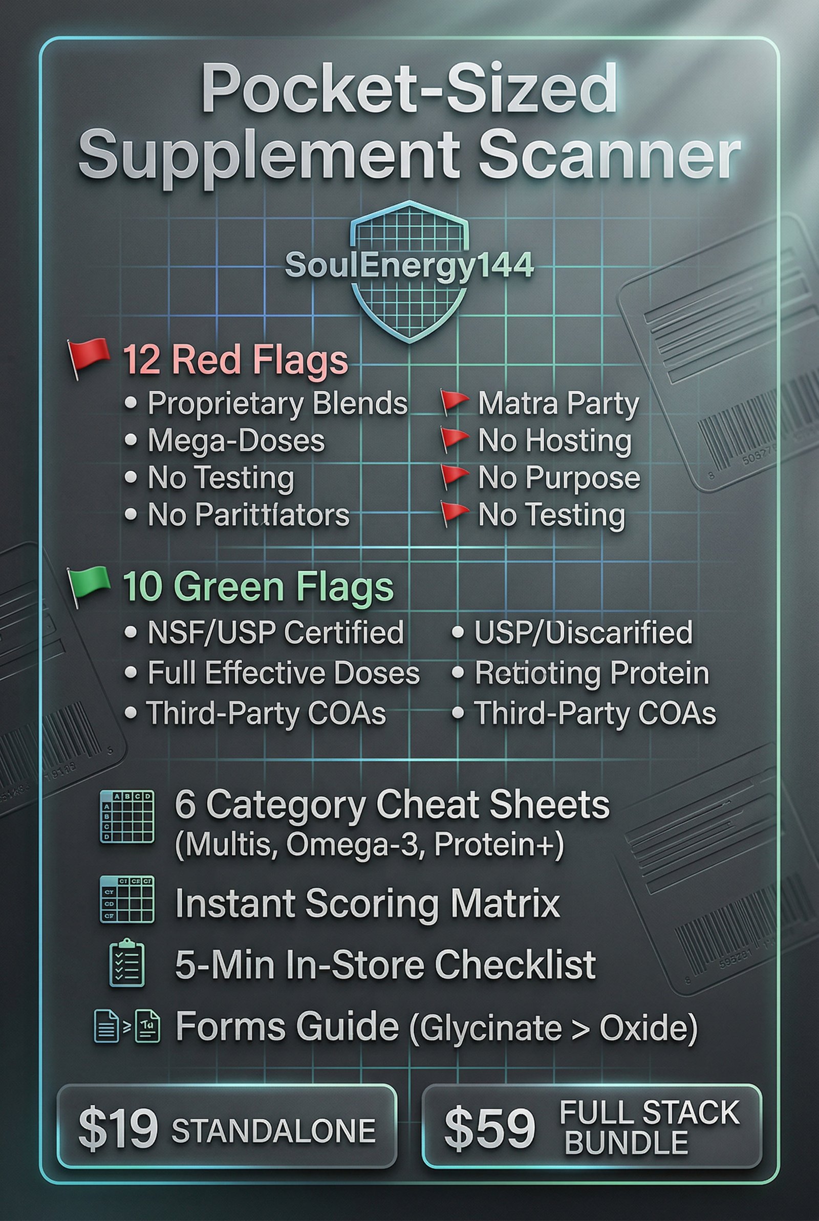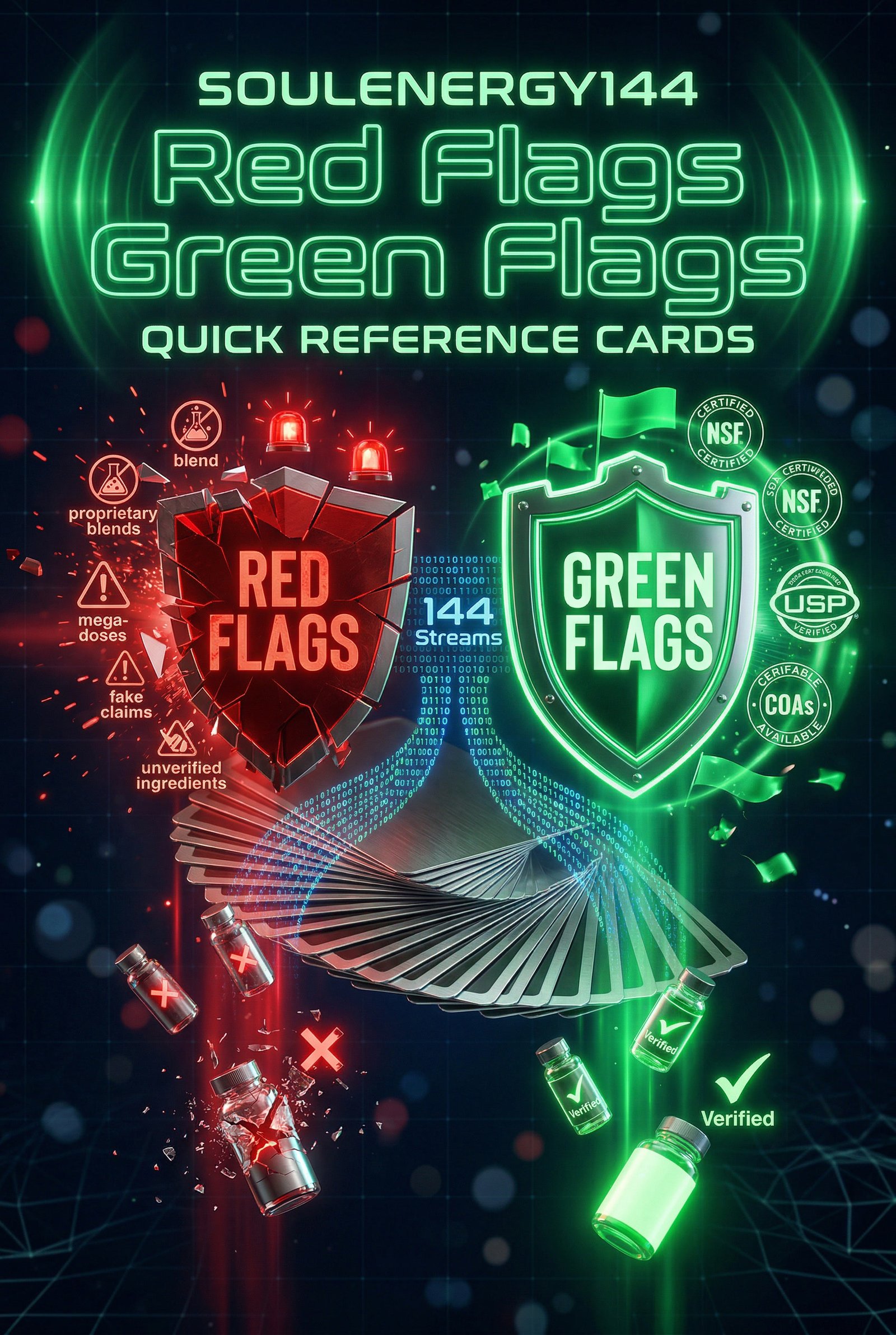 • The Green Flags Card — what a clean, trustworthy supplement actually looks like. Third-party testing seals, transparent labeling, proper dosing, bioavailable forms, and manufacturer standards
