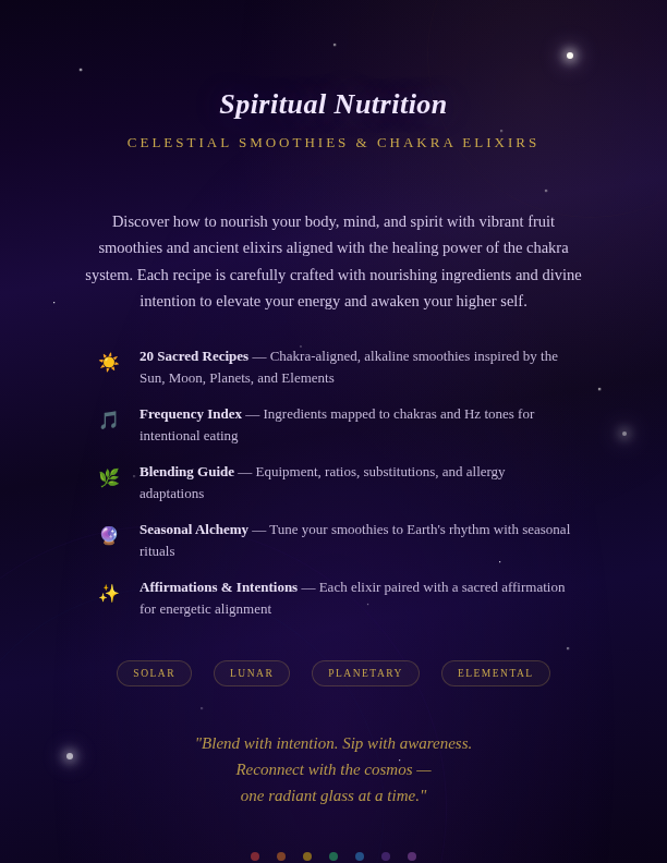 20 chakra-aligned smoothie recipes inspired by the Sun, Moon, Planets, and Elements. Each elixir includes ingredients, step-by-step instructions, affirmations, nutritional insights, and celestial notes — plus a Frequency Index, seasonal blending guide, and shopping list. Blend with intention, sip with awareness.