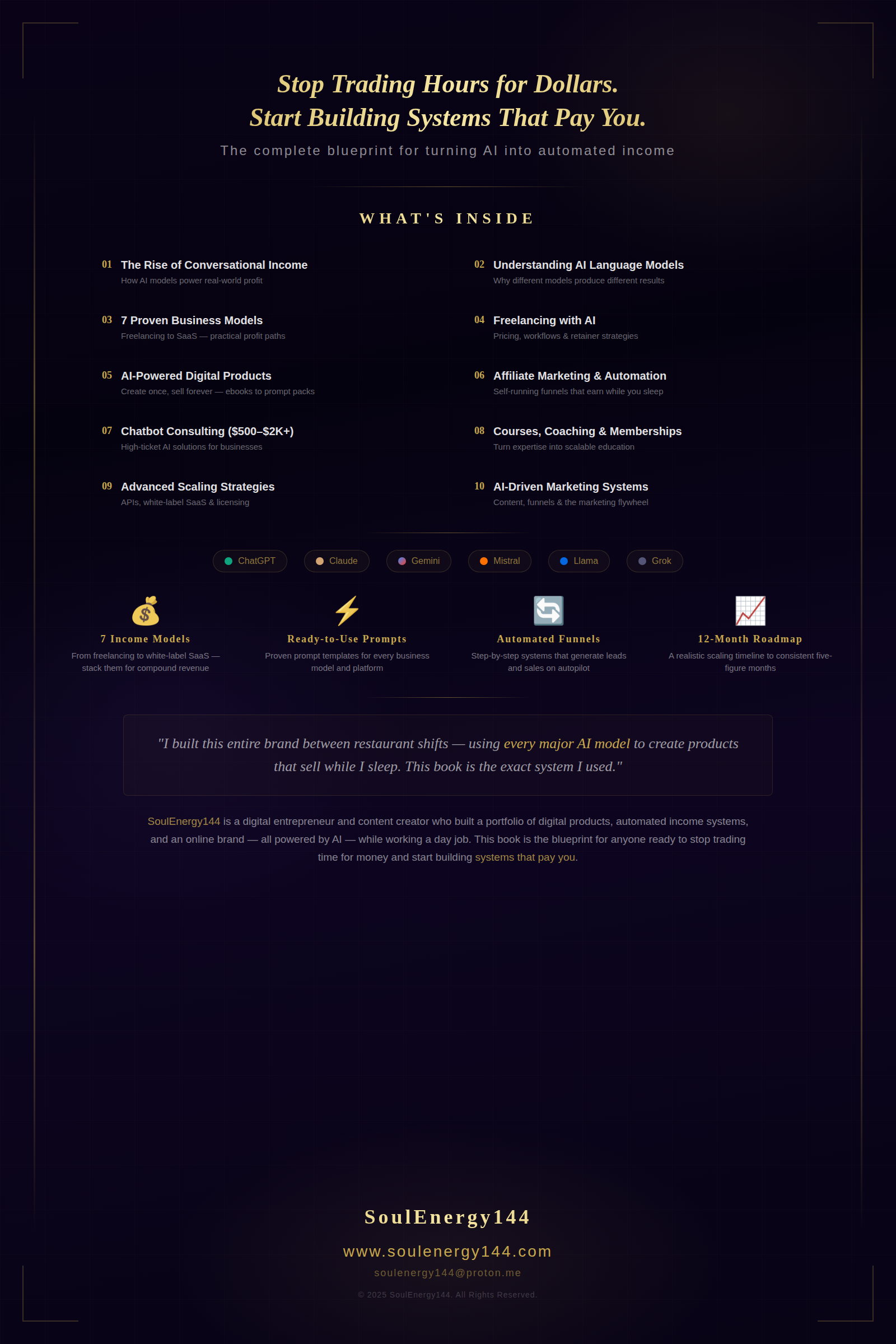 The AI Profit System is a comprehensive, 13-chapter guide that teaches you how to leverage ChatGPT, Claude, Gemini, Mistral, Llama, Grok, DeepSeek, Perplexity, and every major AI language model to build real, scalable income — whether you’re starting from zero or looking to automate what you’ve already built.